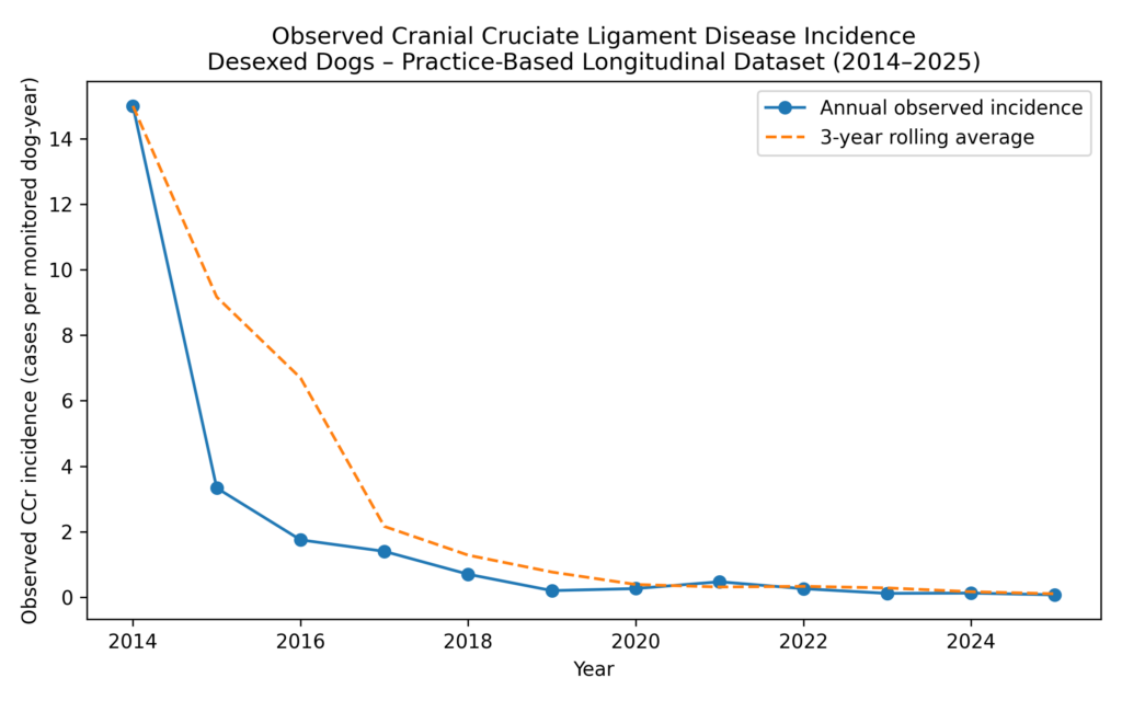 Observed cranial cruciate ligament disease incidence in desexed dogs monitored within a single veterinary practice (2014–2025).